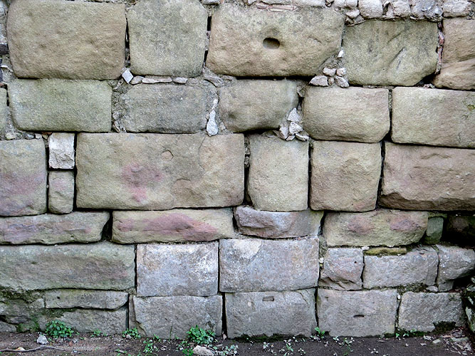 (Ampliar) - Aspecte actual del basament i primeres fileres de carreus de la torre del Llamp. Vegi's la correspondència amb el dibuix de Nolla-Sagrera.