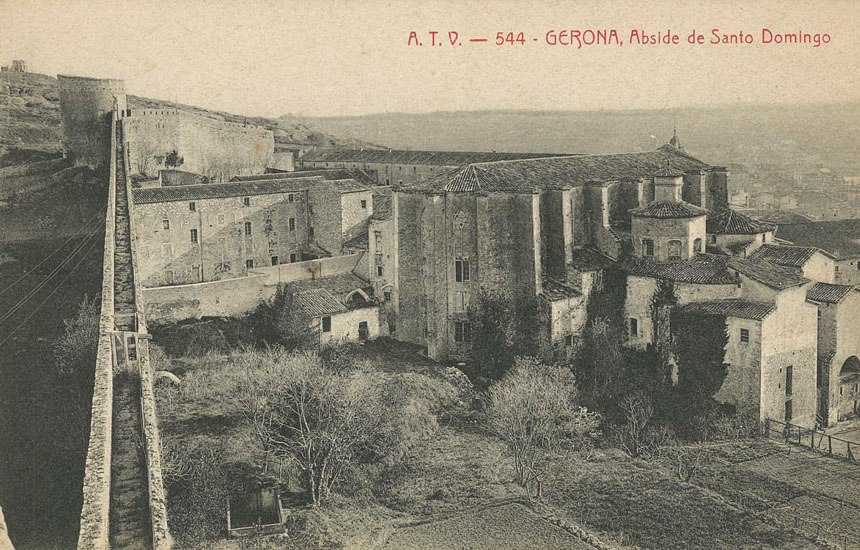 (Ampliar) - Vista des de la muralla del convent i de l'església de Sant Domènec durant els anys que varen ser seu de la caserna militar. A la dreta, un tram de la muralla de Sant Domènec i al fons, la torre homònima. 1905-1911. Eduard Toldrà. CRDI - Ajuntament de Girona.