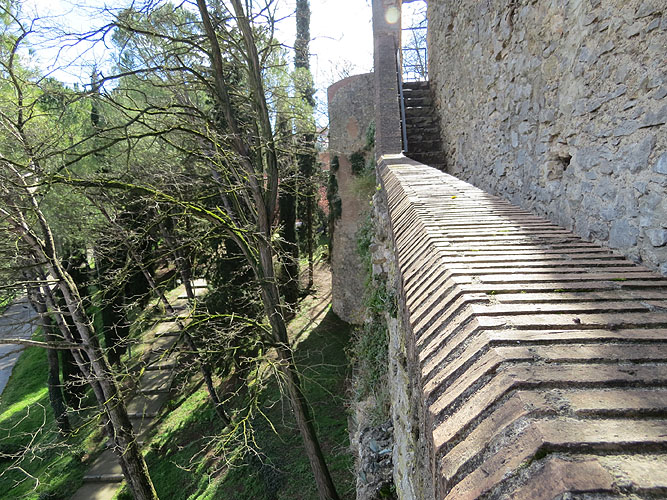 El campanar de Sant Feliu des de la muralla, arribant als Jardins de la Francesa