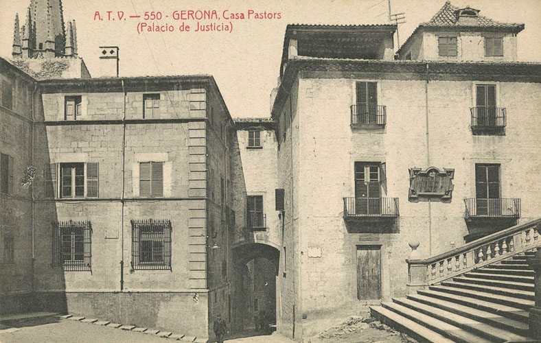 (Ampliar) - Vista del portal de Sobreportes des de la plaça de la Catedral. En primer terme a l'esquerra, la Casa Pastors, posteriorment seu del palau de Justícia i a la dreta, el convent del Cor de Maria. S'observen les obres de construcció dels ressoladors de les escales de la Catedral de Girona. 1904. Autor desconegut. CRDI - Ajuntament de Girona.