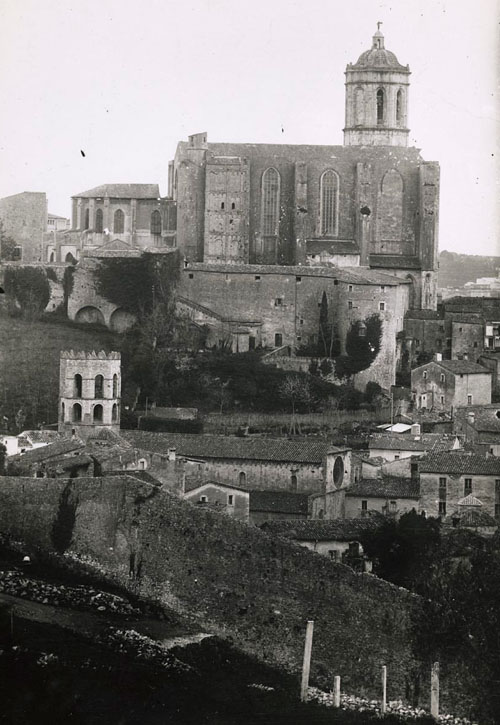 (Ampliar) - Vista de la Catedral de Girona des de la pujada de Montjuïc. En primer terme a la dreta, el monestir de Sant Pere de Galligants anexionat a la muralla. Al centre, el baluard de les Sarraïnes i l'espai que posteriorment ocuparia el passeig Arqueològic, amb la torre Cornèlia. Al fons a la dreta, el campanar de l'església de Sant Feliu. 1896-1915. Autor desconegut. CRDI - Ajuntament de Girona.
