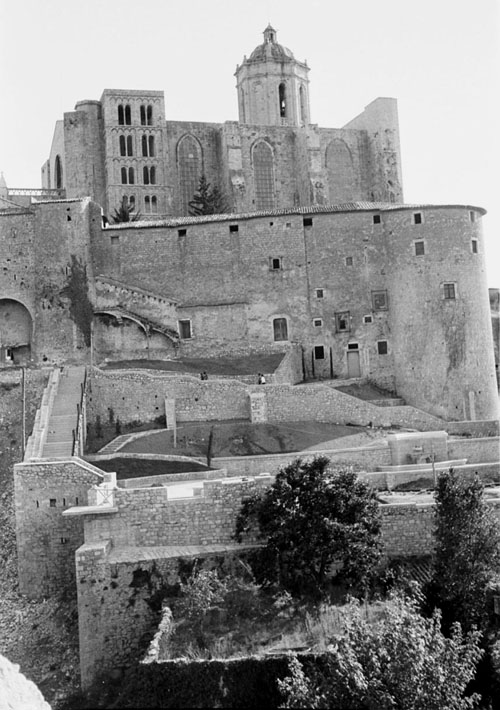 (Ampliar) - Vista del Passeig Arqueològic, de la Catedral i les torres Júlia i Cornèlia. També la torre de Carlemany. 1963. Josep Buil Mayral. CRDI - Ajuntament de Girona.
