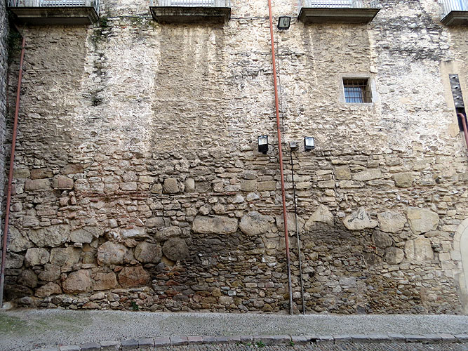 (Ampliar) - Mur al costat de Sobreportes on es poden observar les diverses tècniques constructives de les muralles de Girona, de la fundacional del segle I aC fins les reformes medievals del segle XIV