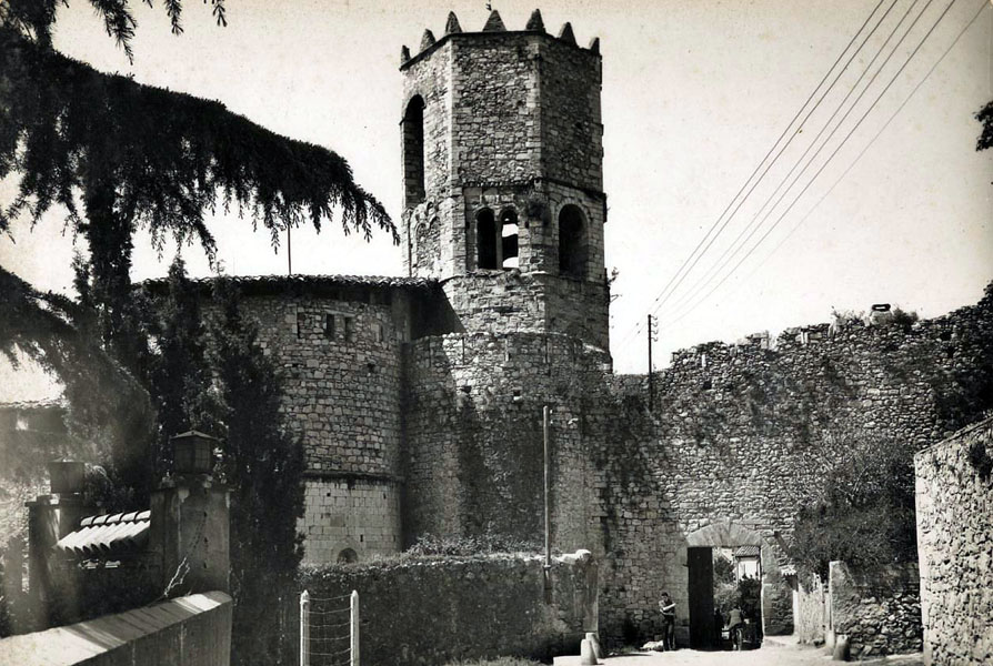 (Ampliar) - Vista de la torratxa de la capella de Santa Llúcia des de la muralla. Al fons, les restes de Torre Gironella. 1920-1930. Autor desconegut. CRDI - Ajuntament de Girona.