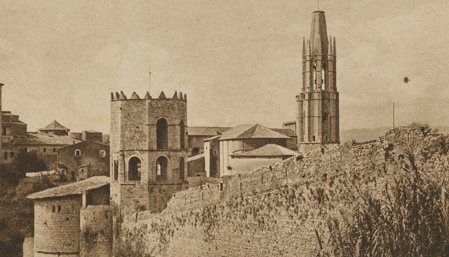 (Ampliar) - El monestirs de Sant Pere de Galligants i el campanar de la Catedral de Girona vistos des del camí vell de Montjuïc. En primer terme, un tram de la muralla. 1930-1940. Autor desconegut. CRDI - Ajuntament de Girona.