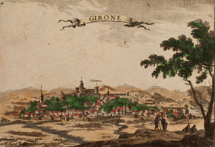 (Ampliar) - Girona al segle XVII. Gravat de Sébastien de Pontault de Beaulieu (Ca. 1612 – 1674) a l'obra Carte de la Principauté de Catalogne, París, Bibliotèque Nationale de França. A la vista, molt idealitzada, s'observa a la dreta la torre del Carme i, enfilant-se cap a les Pedreres, les muralles on es poden identificar les torres.