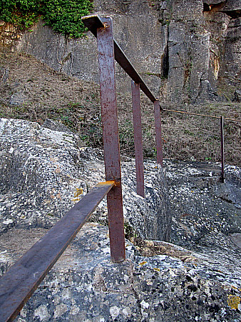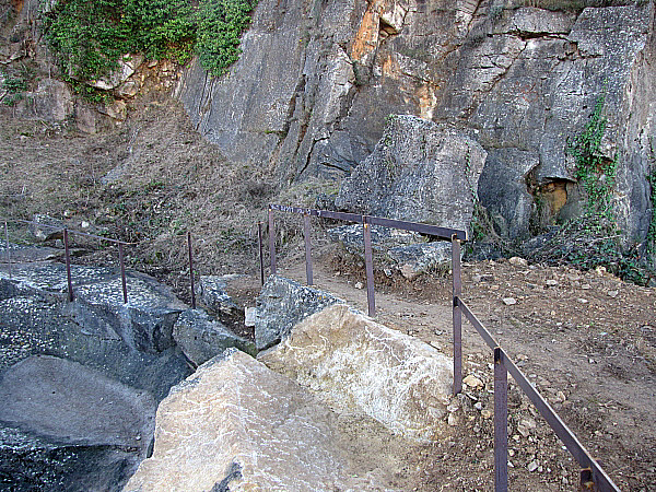 A l'inici de la pedrera, una de les moltes que hi havia en explotació, just on el camí de la Ferradura connecta amb el passeig dels Caputxins, es troben uns blocs de pedra tallada que evoquen els antics oficis vinculats a la pedra: picapedrers, talladors, pedrers, picadors, trencadors de pedra, adobadors, empedradors, bastaixos o camàlics, etc. Aquests oficis, que apareixen documentats des del segle XIV, estaven organitzats en gremis i confraries, un sistema que perdurà fins al primer terç del segle XIX, quan s'extingí amb la reforma liberal. En aquest indret, per les dimensions de l'esvoranc, ens podem fer una idea de la quantitat de pedra que va ser extreta amb finalitats constructives al llarg dels segle en què va estar en funcionament l'explotació. |