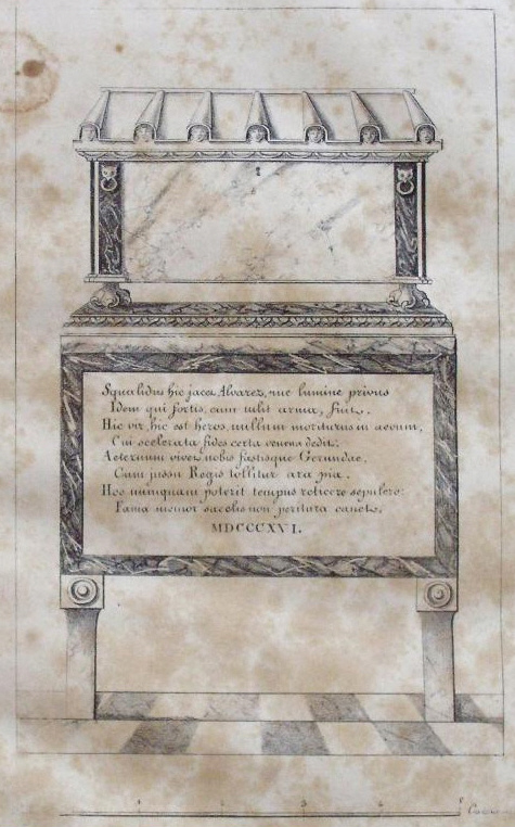 (Ampliar) - Túmulo en que se colocaron las respetables cenizas del Heroe Gobernador de Gerona, el inmortal Alvarez, durante la pompa fúnebre celebrada en aquella Catedral el 30 de Octubre de 1816. Gravat de Josep Barnoya i Domènec Estruc (o Estruch), 1816. Arxiu Municipal de Girona.
