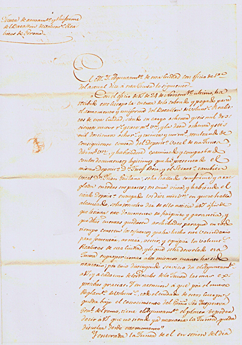 "Con el oficio de VI de 24 de Noviembre ultimo, ha recibido este cuerpo la cuenta de lo cobrado y pagado para el armamento y uniforme del Batallon de Volunts Realistas de esta Ciudad, siendo su cargo ochenta y seis mil dos cientos nueve rs y nueve ms Vn y la data ochenta y seis mil doscientos ocho rs y treinta y un ms, resultando de consiguiente contra el Deposito Vocal de esa Junta diez ms Vn, y habiendo examinado y comprobado con los documentos legitimos que ha presentado el mismo Deposito Dn Josef Bou, y el Secreto tambien Vocal Dn Juan Guilana, se ha hallado conforme y arreglado en todas sus partes; en cuia virtud y habiendo el citado Deposito entregado los diez ms Vn en quese halla alcansado, se ha resuelto dar de ello noticia á VI á fin de que lesirva este documento de finiquito y garantia, y que otras cuentas quedasen archibadas parque en todo tiempo consten los esfuerzos que ha hecho este vecindario para fomentar, armar, vestir y equipar los Volunts Realistas de esta Ciudad, ylo que seha desvelado esa Junta enproporcionar á los mismos cuanto ha sido necesario; por cuio distinguido servicio da el Ayuntamto a VI, y a cadauno de los Vocales de la Junta las mas expresibas gracias. Y en atencion á que por el nuevo Reglamto de Volunts todo el cuidado de estos Cuerpos queda bajo el conocimiento del Exmo. Sor Ynspector Genl del ramo, tiene el Ayuntamto el placer de poder decir á VI que no siendo ya necesaria la Junta, queda disuelta desde este momento"