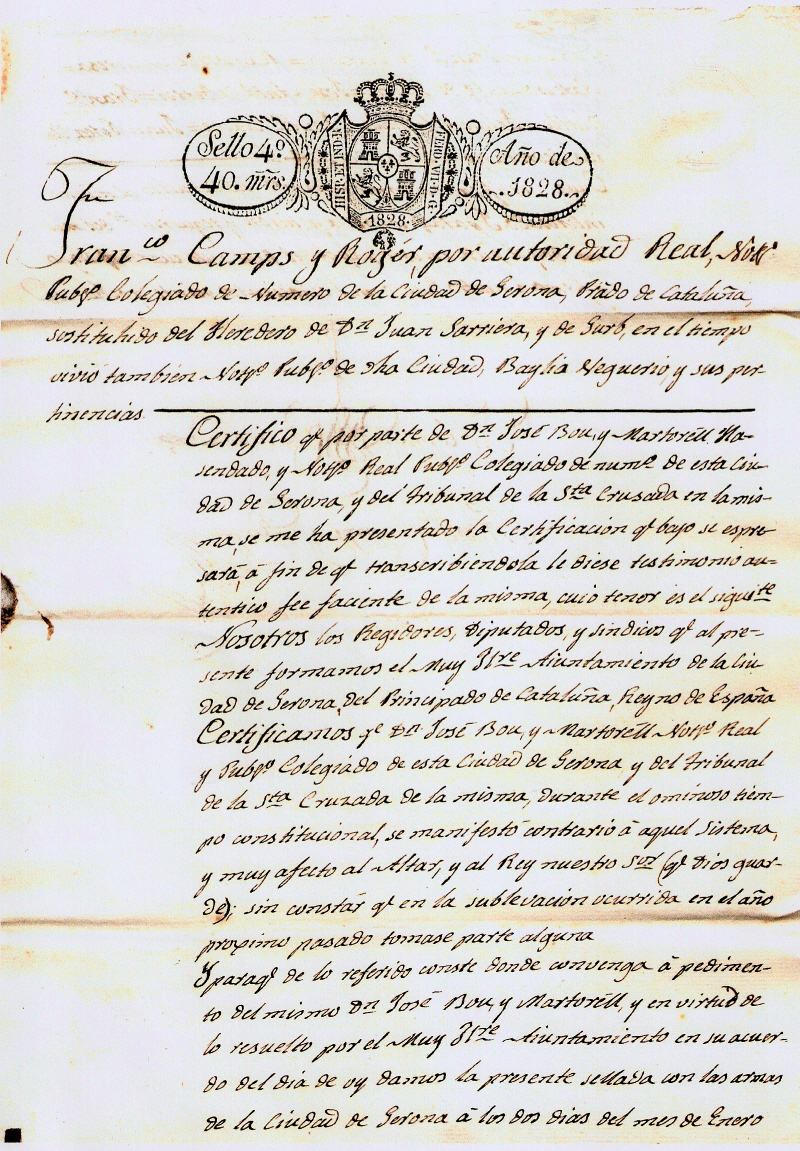 Certifico: Que el Sor Dn Joseph Bou y Martorell Notro Real de la presente Ciudad de Gerona, á pocos dias de haver entrado nuestras tropas en esta Ciudad, y á instalarse en la misma el Ayuntamiento Provincial, disposicion del Sor Gefe Superior Politico de esta Provincia y comunicado al Sor Alcalde de primera instancia de este Corregimiento, comicionado para este objeto, fue nombrado por uno de sus Yndividuos, en la Clase de Regidor, en manifestacion del gran concepto merecia su patriotica conducta durante la invasion enemiga como se le demostró por el citado Alcalde al conferirsele la porcion de su encargo. Luego de tomada, no perdio momento para para [sic] procurar el alivio de sus Consiudadanos en quanto les fue posible, dado para el efecto, con maxime acuerdo de las Personas las mas energicas providencias. Desde el momento de la instalacion del Ayuntamto Provicional, se comunicó á los Yndividuos que lo componian la pronta llegada, y regreso de S.M. el Sor Dn Fernando Septimo nuestro idolatrado Monarca, pasandoles el Exmo Sr General en Gefe de este primer Exercito una nota que contenia los Alojamientos que devian prepararse para S.M. y A.A. y demas comitiva; A cuyo fin comisionó al expresado DnJoseph Bou y Martorell quien en union con otros, en tareas de tanta consideracion, ha desplegado toda su actividad y energia no perdonando medio ni fatiga para que esta Ciudad quedase con la brillantez y lucimiento que era posible atendiendo critica é infeliz situacion en que la havia dexado el enemigo con cuyo motivo lograron la alta satisfaccion de servir á la Mesa de S.M. y A.A. todos los dias que permanecio en esta Ciudad.