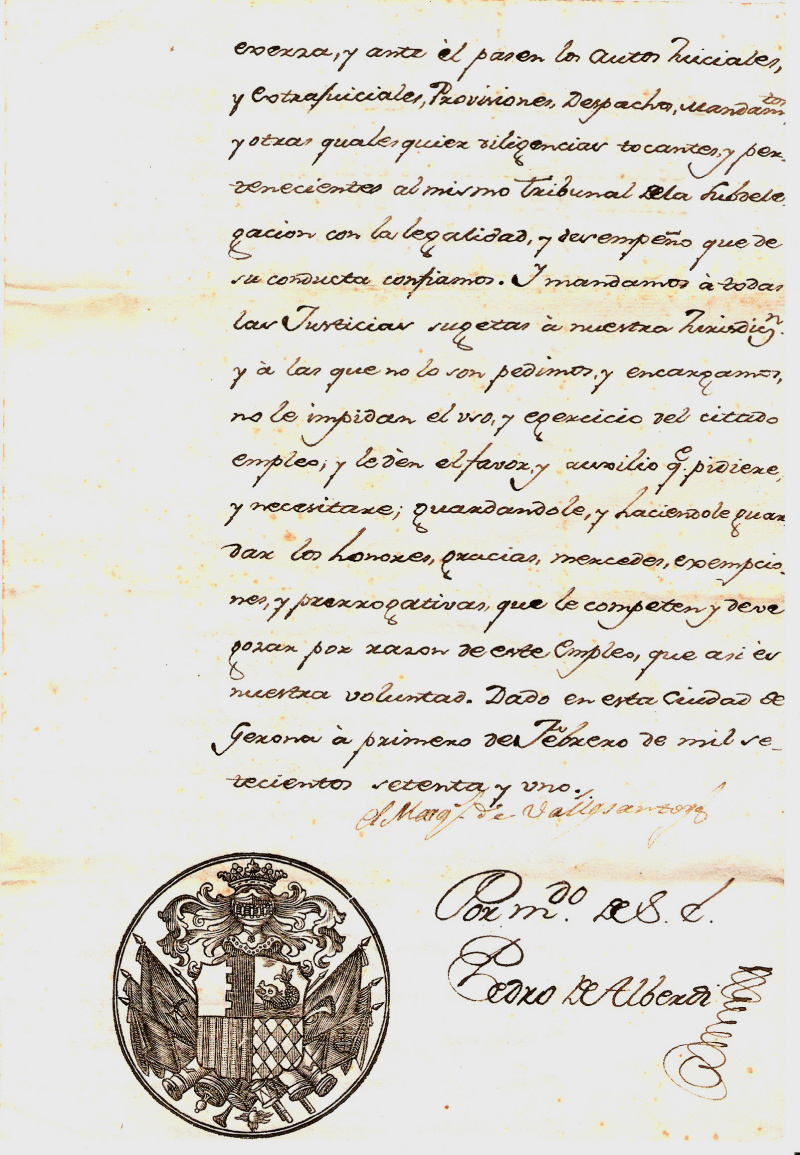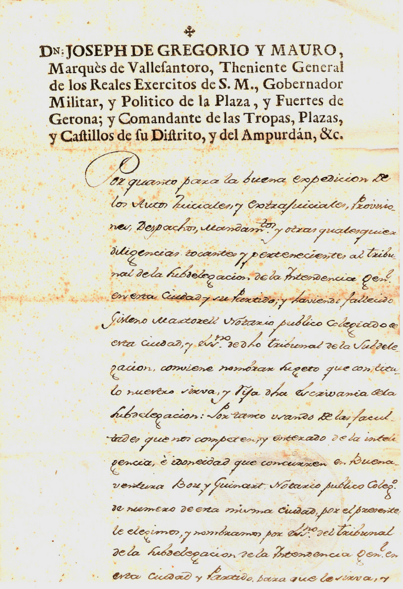 Por quanto para la buena expedicion de los Autos Juiciales y extrajuiciales, Provisiones, Despachos, Mandamtos. y otras qualesquiera diligencias tocantes y pertenecientes al tribunal de la subdelegacion de la Intendencia Genl. en esta Ciudad y en su Partido; y haviendo fallecido Gisleno Martorell Notario publico colegiado de esta ciudad, y Escrno de otro tribunal de la Subdelegacion, conviene nombrar sugeto que con titulo nuestro sirva y rija otra escrivania dela Subdelegacion: Por tanto usando de las facultades que nos competen y enterado de la inteligencia, é idoneidad que concurren en Buenaventura Bou y Guinart, Notario publico Colego. de numero de esta misma ciudad, por el presente le elegimos, y nombramos por escrno del tribunal de la Subdelegacion de la Intendencia Genl. en esta ciudad y Partido, para que le sirva, y exerza, y ante él pasen los Autos Juiciales y extrajuiciales, Provisiones, Despachos, Mandamtos. y otras qualesquiera diligencias tocantes, y pertenecientes al mismo Tribunal de la Subdelegacion con la legalidad y desempeño que de su conducta confiamos. Y mandamos á todas las Justicias sugetas á nuestra Jurisdicn. y á las que no lo son pedimos, y encargamos, no le impidan el uso, y egercicio del citado empleo, y le dén el favor y auxilio qe pidiere, y necesitare; guardandole, y haciendole guardar los honores, gracias, mercedes, exempciones, y prerrogativas, que le competen deve gozar por razon de este empleo, que asi es nuestra voluntad. Dado en esta Ciudad de Gerona, á primero de Febrero de mil setecientos setenta y uno.