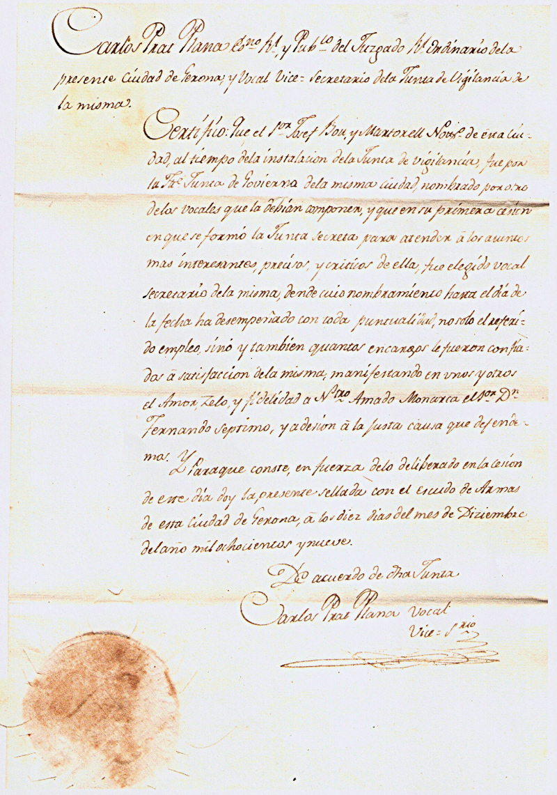 Certifico: Que Joseph Bou y Martorell Notro Real y Publo. y del Colegio de esta Ciudad de Gerona, y Vocal Secretario de la Junta de Vigilancia establecida en la misma, es otro de los que á mis ordenes durante el presente asedio sufre esta Ciudad, ha acistido, y aciste en la Muralla, ó Cortina llamada de la Puerta del Carmen, dende que se halla restablecido de la agudissima enfermedad que durante este asedio le ha afligido, acudiendo puntualmente al punto se le ha mandado, y manda no obstante las muchas ocupaciones de su empleo de Vocal Secretario, manifestando en uno y otro su acreditado patriotismo, y zelo en defensa de la justa causa que defendemos; Y para que conste á instancias del mismo Ynteresado, doy la presente firmada de mi mano, y sellada con el Sello de Armas de esta Ciudad, en Gerona, á ocho de Diciembre de mil ochocientos y nueve.