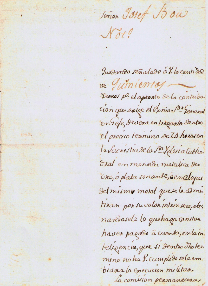 Quedando señalado á V. la cantidad de Quinientos Duros pa el apronto de la contribucion que exige el Exmo Sor General en Gefe, devera entregarla dentro el preciso termino de 24 horas en la Sacristia de la Sta Yglesia Cathedral en moneda metalica de oro ó plata sonante, ó en alajas del mismo metal que se le admitiran por su valor intrínseco, abonandosele lo que haga constar haver pagado á cuenta, en la inteligencia, que si dentro dho termino no ha V. cumplido se le embiara la execucion militar.