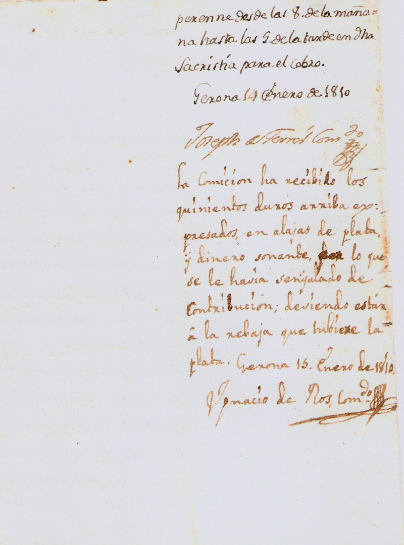 La comicion ha recibido los quinientos duros arriba expresados en alajas de plata, y dinero sonante por lo que se le havia senyalado de Contribucion, deviendo estar á la rebaja que hubiere la plata. Gerona 15 Enero de 1810.