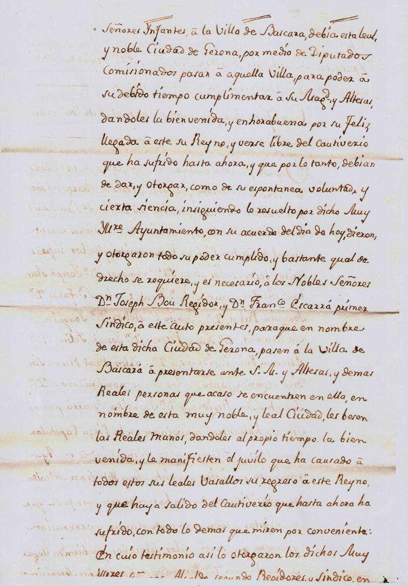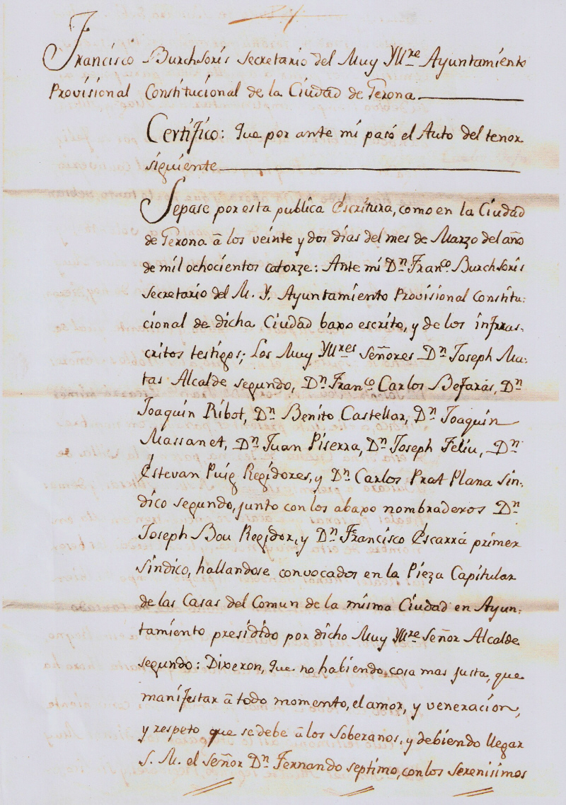 Sepase por esta publica Escritura, como en la Ciudad de Gerona á los veinte y dos dias del mes de Marzo del año de mil ochocientos catorze: Ante mí Dn Franco Burch Sorís Secretario del M.Y Ayuntamiento Provisional Constitucional de dicha Ciudad baxo escrito, y de los infrascritos testigos; Los Muy Yltres Señores Dn Joseph Matas Alcalde segundo, Dn Franco Carlos Befarás, Dn Joaquin Ribot, Dn Benito Castellar, Dn Joaquin Massanet, Dn Juan Piserra, Dn Joseph Feliu, Dn Estevan Puig Regidores, y Dn Carlos Prat Plana Sindico segundo, junto con los abaxo nombrados Dn Joseph Bou Regidor y Dn Francisco Escarrá primer Sindico, hallandose convocados en la Pieza Capitular de las Casas del Comun de la misma Ciudad en Ayuntamiento presidido por dicho Muy Iltre Señor Alcalde segundo: Dixeron, Que no habiendo cosa mas justa, que manifestar á todo momento, el amor, y veneracion, y respeto que se debe á los Soberanos, y debiendo llegar S.M. el Señor Dn Fernando septimo, con los Serenisimos Señores Ynfantes, á la Villa de Bascara, debia esta leal , y noble Ciudad de Gerona, por medio de Diputados Comisionados pasar á aquella Villa, para poder á su debido tiempo cumplimentar á Su Magd Y Altesas, dandoles la bienvenida, y enhorabuena por su Feliz llegada á este su Reyno, y verse libre del cautiverio que ha sufrido hasta ahora, y que por lo tanto, debian de dar, y otorgar, como de su espontanea voluntad, y cierta siencia, insiguiendo lo resuelto por dicho Muy Iltre Ayuntamiento, con su acuerdo del dia de hoy, dieron, y otorgaron todo su poder cumplido, y bastante qual de derecho se requiere, y es necesario, á los Nobles Señores Dn Joseph Bou Regidor, y Dn Franco Escarrá primer Síndico, á este auto presentes, para que en nombre de esta dicha Ciudad de Gerona, pasen á la Villa de Bascara á presentarse ante S.M. y Altesas, y demas Reales personas que acaso se encuentren en ella, en nombre de esta muy noble y leal Ciudad, les besen las Reales manos, dandoles al propio tiempo la bienvenida, y le manifiesten el juvilo que ha causado á todos estos sus leales Vasallos su regreso á este Reyno, y que haya salido del cautiverio que hasta ahora ha sufrido, con todo lo demas que miren por conveniente: En cuio testimonio así lo otorgaron los dichos Muy Iltres Señores Alcalde segundo, Regidores y Síndico, en el dia, mes, año, y puesto arriba notados, siendo presentes por testigos Manuel Artigas y Melchor Dañans, Porteros de dicho M.Y. Ayuntamto para esto llamados, y rogados. Y los dichos Yltres Señores Otorgantes á quienes yo el infrascrito Secretario doy fé conocer lo firmaron de sus propias manos = Joseph Matas = Franco Carlos Befarás = Dn Joaquin Ribot = Benito Castellar = Joaquin Massanet = Juan Piserra = Joseph Feliu = Estevan Puig = Carlos Prat Plana = Ante mi Franco Burch Sorís Secretario.