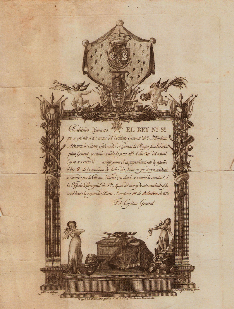 Habiendo dispuesto EL REY No Sr que se efectúe a los restos del Teniente General Dn Mariano Alvarez de Castro Gobernador de Gerona la Pompa funebre de Capitan General; y estando señalado para ello el dia 26 del actual: Espero se servira V. asistir para el acompañamiento de aquellos á las 8 de la mañana de dicho dia, hora en que deven conducirse entrando por la Puerta Nueva (en donde se reunirá la comitiva) á la Yglesia Parroquial de Sta Maria del mar y de esta concluido el funeral, hasta la expresada Puerta. Barcelona 18 de Octubre de 1816.