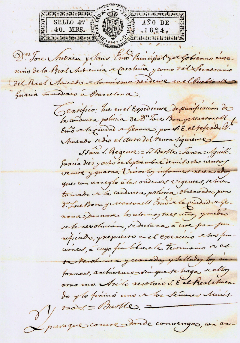 SSmaS. Regente = SS. Batlle = Jaren = Aguiló. Gracia diez y ocho de Septiembre de mil ochocientos veinte y quatro. Vimos los informes reservados que con arreglo á las ordenes vigentes, se han tomado de la conducta politica observada por dn Jose Bou y Martorell Exmo de la ciudad de Gerona, durante los ultimos tres años y medio de la revolución, se declara á este por purificado, y repuesto en el exercicio de sus funciones, á cuyo fin librole testimonio de esta resolucion y cerrados y sellados los informes, archiveme sin que se haga dellos otro uso. Así lo resolvió S.E. el Real Acuerdo y lo firmó uno de los Señores Ministros = Batlle