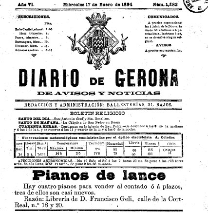 (Ampliar) - Anunci de la llibreria Geli publicat a Diario de Gerona del 17 de gener de 1894. CRDI - Ajuntament de Girona.
