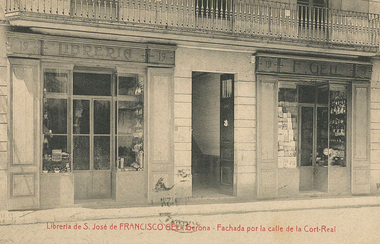 (Ampliar) - Façana de la llibreria Geli a la Cort Reial. 1900-1920. Autor desconegut. Col·lecció Ajuntament de Girona.Can Geli era una llibreria religiosa i progressista, però el segon tret no la va salvar de la ira d'uns revolucionaris que van entendre que pesava més la seva vinculació amb l'església que l'aposta per la modernitat. Després dels dies ateus, a la llibreria es va tornar a entronitzar la imatge de Sant Josep, protector de l'Església i la família, i va exercir tant de botiga com de centre d'agitació ciutadana des del qual tant es repartien invitacions per a l'acte cultural hispano-japonès organitzat per la Jefatura Provincial de Propaganda, que va omplir l'antic teatre Albéniz amb una campanya recomanada per "las altas Jerarquías del Estado y del Movimiento" (24 de novembre 1939), com es recaptaven diners per salvar un convent de la Bisbal o es donava suport a l'organització de pelegrinatges a Montserrat, a Lorda o a Vic per visitar la tomba d'Antoni Maria Claret.