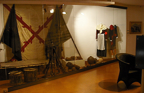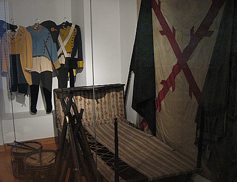 Vista general de la vitrina amb uniformes, banderes, tambors, armes i un llit de campanya.