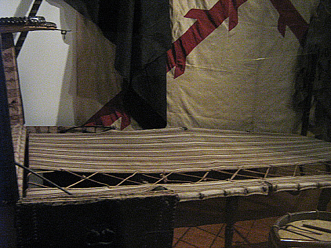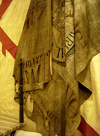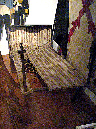 Un llit militar de campanya; al fons, la bandera del regiment Ultònia.