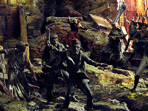 En un dels laterals de la sala es presenta un diorama de grans dimensions amb una escena de l'atac al portal i baluard de Sant Cristòfol durant els fets del 19 de setembre de 1809, l'anomenat Gran Dia de Girona. Aquest dia, des de primeres hores, les bateries franceses intensificaren encara més el seu bombardeix contra els esvorancs oberts a les muralles, el fort del Calvari i la torre Gironella, i la muralla de Santa Llúcia. El seu atac va eixamplar considerablement els dos esvorancs de dies anteriores a Alemanys, per on ja podien passar 40 soldats de front. A les quatre de la tarda, columnes escollides de tropes franceses sortiren del castell de Montjuïc i es dirigiren, una, a atacar el fort del Calvari, i les altres els esvorancs de la muralla d'Alemanys i de Santa Llúcia. Els atacs, que en successives onades arribaren al cos a cos, foren aturades pels defensors. ![]() Alguns atacants es reorganitzaren a redòs contra el foc que se'ls feia des de les muralles, la veïna torre Gironella i el baluard de Sarraïnes. Un escamot dels soldats assetjants aconseguí passar l'esvoranc d'Alemanys, i arribar fins el pati de la caserna i entrada a la plaça dels Lledoners; un destacament d'Ultònia apostat a la plaça dels Apòstols va aconseguir rebutjar-los del tot. ![]() El general Verdier va veure com el seu pla d'atac fracassava estabellant-se una i altra vegada contra les defenses de la ciutat. Ateses les dificultats que tenia la ciutat per obtenir queviures i altres materials, els napoleònics optaren més pel setge que per a noves escomeses. ![]() Fotografies preses per gentilesa del Museu d'Història de la Ciutat.