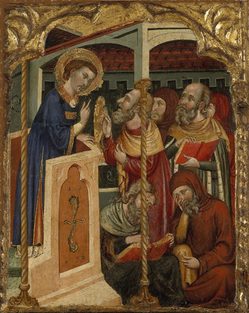![]() Sant Esteve i els jueus a la sinagoga. Segle XIV. Predel·la del retaule de Sant Esteve. Cercle d'Arnau Bassa. Museu Nacional d'Art de Catalunya - (Ampliar) ![]() Carta dels Jurats de Girona. Ordinacions dels Jurats. Girona, 10 d'agost de 1391. Els jurats escriuen al rei per comunicar-li l'atac al call - (Ampliar) ![]() Edicte d'expulsió dels jueus. Manual d'Acords, Girona 20 abril de 1492, anvers - (Ampliar) ![]() Edicte d'expulsió dels jueus. Manual d'Acords, Girona 20 abril de 1492, revers - (Ampliar) ![]() Jueu. Llibre Verd de Girona 1144-1533 - (Ampliar) ![]() Al·legoria de la Sinagoga. Segle XIII. Castella. Fusta tallada i policromada. Col·lecció el Conventet, Barcelona - (Ampliar) ![]() Detall del retaule de Sant Marc de la seu de Manresa. Arnau Bassa, 1346. La nit de Sant Llorenç de 1391 els baptisteris de totes les esglésies de Girona estaven oberts i amb capellans a punt per tal de batejar els jueus que hi arribaven apressats, fugint de la violència i buscant salvar la vida amb l'aigua del baptisme - (Ampliar) ![]() Amulet hebreu amb escrits cabalístics d'invocació als àngels protectors. Tinta sobre pergamí. Segle XVII. Europa de l'est - (Ampliar) ![]() Samarra. La samarra amb dibuixos de flames i rostres diabòlics indica que el condemnat no s'ha penedit i serà cremat viu. Gravat de "Historia Inquisitionis" de Philipp van Limborch, Amsterdam 1692 - (Ampliar) |