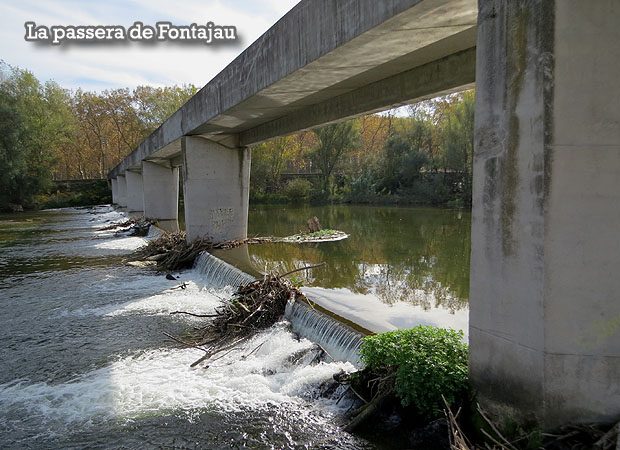 La passera fa 150 metres de llargada i 2,55 d'amplada, i està situada a sis metres per damunt del nivell mitjà del riu. Els onze trams de bigues que la formen se sustenten sobre sis pilars de ciment armat, quatre al mig del llit del riu i dos a la vora esquerra. A diferència del que sol ser habitual, el pont no presenta baranes metàl·liques; està protegit per dues parets de mitja alçada, una de formigó i l'altra d'acer i fusta resistent als canvis de temperatura i humitat. És molt utilitzada com a via d'accés als mercats que se celebren els dimarts i dissabtes al vial perimetral de la Devesa, sobretot els veïns dels barris de Fontajau, Germans Sàbat i Taialà. També és molt utilitzada per accedir del centre de la ciutat als itineraris i parc de les Ribes del Ter.