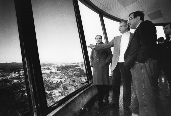 (Ampliar) - Inauguració de la Torre de comunicacions. 1992. S'hi observa el senador Francesc Ferrer i Gironès, el ministre Josep Borrell i l'alcalde de Girona, Joaquim Nadal. Anna Carreras Vidal. CRDI - Ajuntament de Girona. La construcció. La torre va començar a ser construïda per l'empresa Ferrovial l'agost de 1990. El setembre de 1991 ja estava enllestida i va ser inaugurada pel ministre Josep Borrell el 25 de gener de 1992. La inversió de Telefònica d'Espanya va ser de 700 milions de pessetes (4.200.000 d'euros) dels quals 300 es destinaren a l’obra civil (torre i edifici annex) i la resta a tot l’equipament de transmissió, més 25 milions que es destinaren a l'adquisició del terreny.