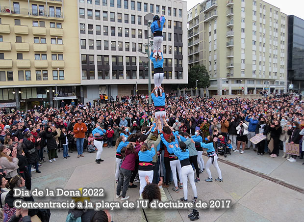 El vespre del dimarts 8 de març de 2022, per commemorar el Dia de la Dona, es va fer una concentració a la plaça de l'U d'octubre de 2017, convocada per la Coordinadora de Feminismes Anticapitalista de Girona sota el lema de "Fartes de sostenir allò insostenible", que va reunir 1.500 persones. Les Xorigueres de la UdG varen un pilar al mig de la plaça, amb l'enxaneta sostenint un tros de tela lila, i a continuació diverses actuacions musicals i la lectura del manifest d'aquest 8-M.