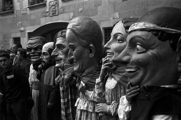 - Els capgrossos de Girona. Dia de Sant Narcís de 1961, a la porta de l'església de Sant Feliu. Fotografia de Narcís Sans. Fons Ajuntament de Girona.