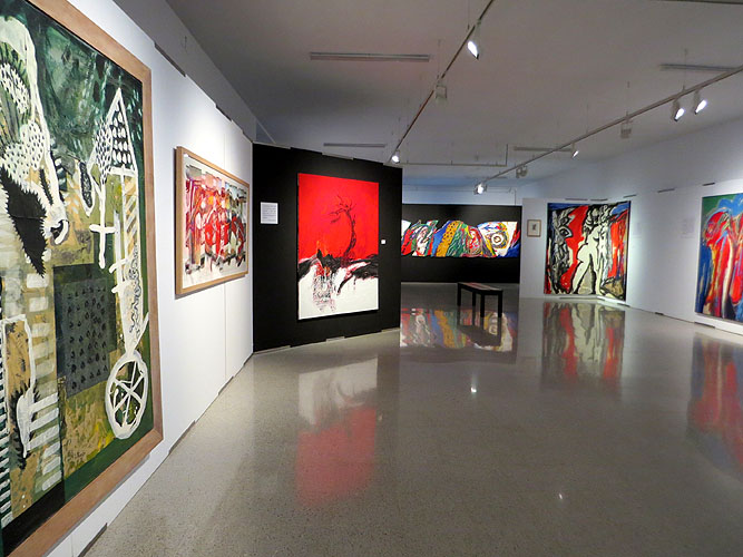 (Ampliar) - Una de les sales de l'exposició.Quim Corominas (1951, Sarrià de Ter), de formació autodidacta, ha combinat durant anys la creació visual i la docència artística a Girona. El seu treball creatiu abasta pintura, cartells, obra gràfica i llibres artístics. És autor de llibres experimentals i desplegables i col·leccionista de joguines de paper. A més de la pintura sobre tela i sobre paper amb combinacions del collage i l’assemblatge, també treballa la tècnica del gravat i la litografia. Ha exposat la seva obra a Girona, Barcelona, a diferents ciutats de l’Estat Espanyol, Londres, Berlín, Amsterdam i a varies ciutats de França i Itàlia.