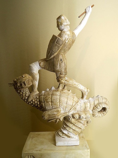 (Ampliar) - Sant Jordi i el drac. 1917. Guix de ceràmiques Marcó obtingut de l'original de Fidel Aguilar, no localitzat. Col·lecció Jaume Marcó, Quart.