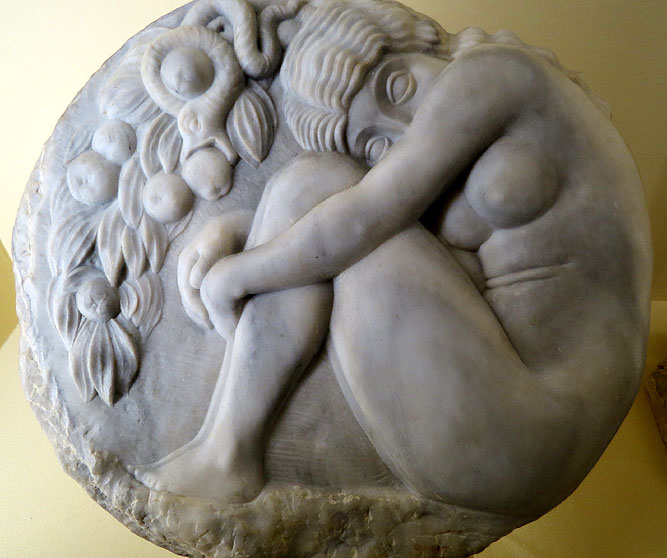 (Ampliar) - Gran medalló de marbre que representa Eva i la serp.
