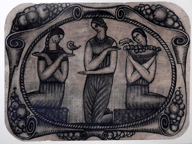 (Ampliar) - Fidel Aguilar. Composició amb tres figures femenines. Ca. 1916. Carbó sobre paper. Col·lecció Cristina Arxer, Figueres. |