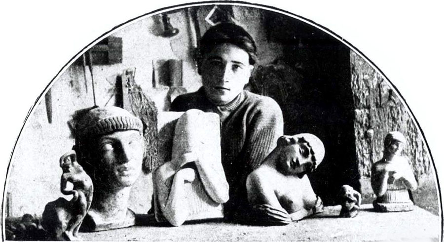 (Ampliar) - Retrat de l'artista Fidel Aguilar al seu estudi rodejat per algunes de les seves escultures. 1910-1917. Autor desconegut. CRDI - Ajuntament de Girona. Pocs artistes deu haver-hi a Girona que inspirin tanta tendresa com Fidel Aguilar. Les seves escultures de figures esveltes, sinuoses i fràgils formen un dels imaginaris més seductors de l'art gironí de la primera meitat del segle XX, més encara pel fet que representen el testament joiós d'una trajectòria truncada en plena joventut. La mort de l'artista quan tot just tenia vint-i-dos anys ha contribuït, sense cap dubte, a estendre una aurèola de genialitat i malastrugança al voltant d'una obra que, per contrast amb l'ambient provincià on va ser creada, ha estat examinada sovint com una excepció o un miracle, o bé com una emanació del projecte de moernitat que va fer seu el nucli noucentista local, del qual Aguilar hauria estat un deixeble aplicat, tot i que certament original a causa en bona part del caràcter indecís i inacabat del seu treball. La mitologia al voltant de l'artista s'ha sustentat de fet en aquestes dues categories oposades: soledat i obediència.