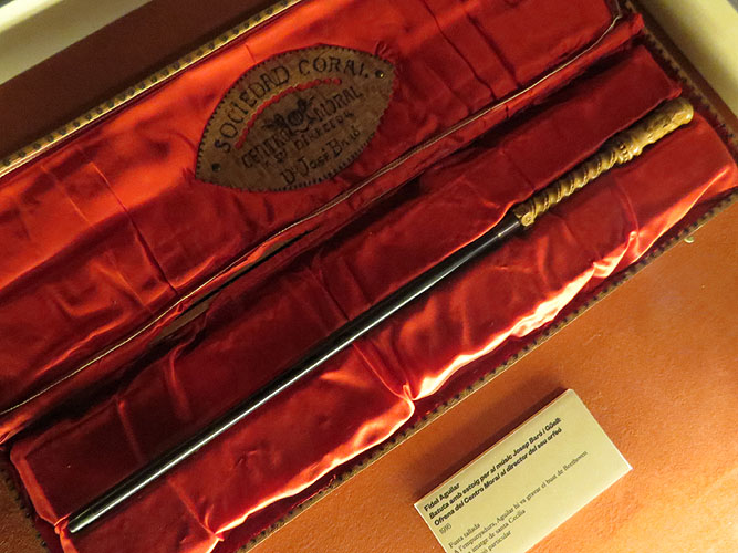 (Ampliar) - Batuta amb estoig per al músic Josep Baró i Güell, ofrena del Centro Moral al director del seu orfeó. 1916. Fusta tallada. A l'empunyadura, Aguilar hi va gravar el bust de Beethoven i una imatge de santa Cecília. Col·lecció particular.