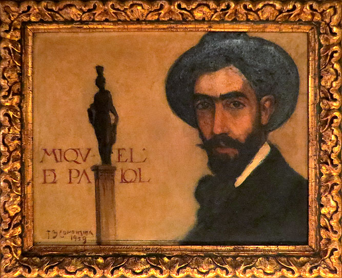 (Ampliar) - Joan B. Coromina. Retrat de Miquel de Palol amb una tanagra. 1910. Oli sobre tela. Col·lecció Maria de Palol, Girona. El descobriment de la pedra. El primer contacte amb l'escultura provenia del seu mateix ofici d'ebenista, que va fimiliaritzar-lo des de la infància amb la talla de figuretes de fusta. La influència dels principals renovadors de l'escultura contemporània va despertar-li, però, l'interès per esculpir directament la pedra, segurament amb el propòsit d'abordar peces més ambicioses que no seria a temps de dur a terme. D'aquestes provatures, han quedat algunes de les millors obres de Fidel Aguilar: un gran medalló de marbre que representa Eva i la serp, un parell de bustos femenins de marbre rosa, un petit cap tallat en un rierenc i tres caps més de pedra cisellada per als quals va fr servir fragments enrunats dels carreus de les muralles. La duresa del material va dpnar a la seva escultura un nou valor formal que l'emparenta, més que no pas ho havien fet les seves gràcils figuretes de fang, amb l'obra madura de Manolo Hugué o Enric Casanovas. És remarcable el caràcter androgin d'aquests caps, que han plantejat dubtes de gènere, en contrast amb la potència viril, fins i tot malhumorada, dels seus herois i atletes.