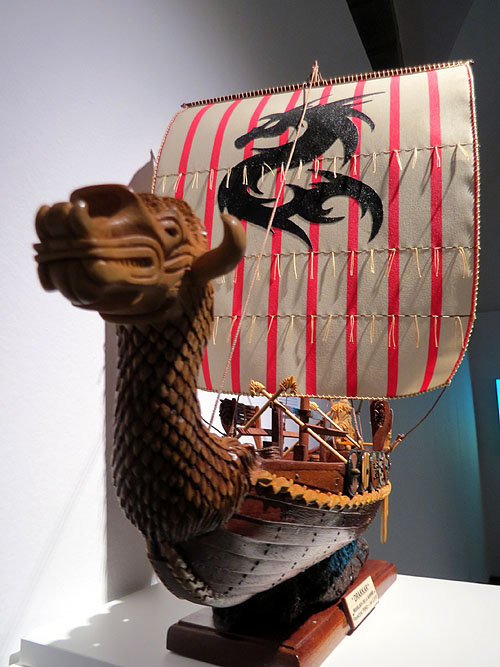 (Ampliar) - Drakkar. Embarcació del nord d'Europa construïda seguint el procediment dins-fora, sense estructura interior, i pel procediment de tarima. Modelista: Francesc Pérez.