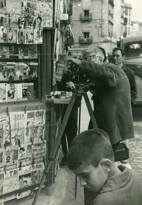 - Rodatge del film "La Bombeta". Antoni Varés filmant al costat del quiosc de la Plaça Catalunya. 1965. CRDI - Ajuntament de Girona.