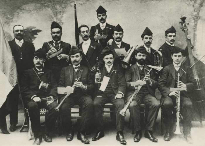 - Retrat d'estudi dels components d'una cobla amb els instruments a la ma. 1910-1920. Autor desconegut. Col·lecció Ajuntament de Girona.