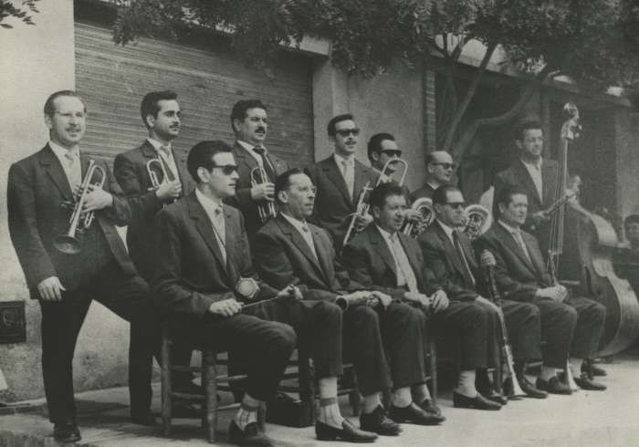 - Els components de la Cobla La Principal de Girona amb els seus instruments durant una actuació. 1940-1950 Autor desconegut. Col·lecció Ajuntament de Girona.