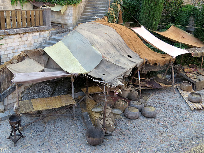 (Ampliar) - Detall de l'escenari muntat al carrer Ferran el catòlic. A la zona del carrer Ferran el catòlic, davant els Banys Àrabs, és on el muntatge està més avançat, i s'hi representa un mercat marítim. També s'està treballant a la plaça dels Jurats, on s'hi instal·la un teatre, i s'ha iniciat la decoració de les escales de Sant Domènec.