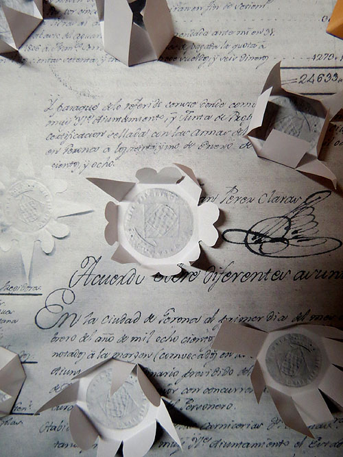 (Ampliar) - Al centre: document gironí del segle XIX amb el segell que l'autentifica embolcallat de paper retallat i plegat (rèplica). A l'entorn, treballs de Pericot que hi són inspirats.