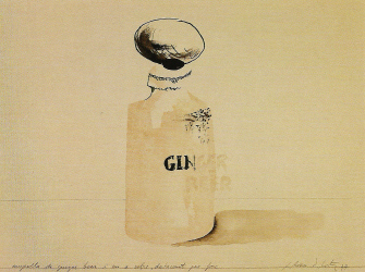 Ampolla de ginger beer i ou a sobre, destacant per fosc. 1977. Aquarel·la i tinta. 24 x 32 cm