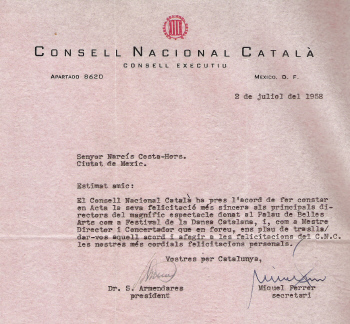 Felicitación del Consell Nacional Català 2 de juliol de 1958 Senyor Narcís Costa-Hors Estimat amic: El Consell Nacional Català ha pres l'acord de fer constar en Acta la seva felicitació més sincera als principals directors del magnífic espectacle donat al Palau de Belles Arts com a Festival de la Dansa Catalana, i, com a Mestre Director i Concertador que en foreu, ens plau de traslladar-vos aquell acord i afegir a les felicitacions del C.N.C. les nostres més cordials felicitacions personals. Vostres per Catalunya Dr. S. Armendares President / Miquel Ferrer Secretari |