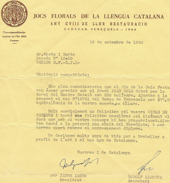 Otorgamiento del premio Joan Gols en los Jocs Florals de 1966 19 de setembre de 1966 Sr. Costa i Horts Distingit compatriota: Ens plau comunicar-vos que el dia de la Gaia Festa vau ésser premiat amb el Premi JOAN GOLS dotat per la Coral del Centre Català amb 350 bolívars. Adjuntem a la present el xec Nº15741 del Banco de Venezuela per $77,80, equivalència de la nostra moneda en dòlars. Molt cordialment us felicitem pel voste CICLE DE CANÇONS i també ens felicitem nosaltres pel lluïment als Jocs que amb el vostre concurs hi heu proporcionat. Ajuntem també a la present una còpia del Veredicte, i per correu apart rebreu el corresponent diploma. Us desitjem molts anys de vida per a treballar a profit de l'art i el bon nom de Catalunya. Vostres i de Catalunya Per JAUME ISERN, President / RODOLF LLORENS, Secretari |