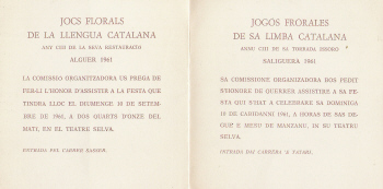 JOCS FLORALS DE LA LLENGUA CATALANA La comissió organitzadora us prega de fer-li l'honor d'assistir a la festa que tindra lloc el diumenge 10 de setembre de 1961, a dos quarts d'onze del matí, en el teatre Selva. Entrada pel carrer Sasser.