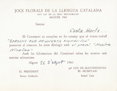 Senyor Costa Horts El Consistori es complau en fer constar que el vostre treball "SARDANA PER ORQUESTRA SIMFÒNICA" presentat al concurs, ha estat distingit amb el premi "Mestre Nicolau". Amb les felicitaciones del Consistori rebeu les nostres més atentes salutacions Alguer 26 d'agost 1961 EL PRESIDENT Ferran Soldevila / Pel COS DE MANTENEDORS EL SECRETARI Rafael Tasis |