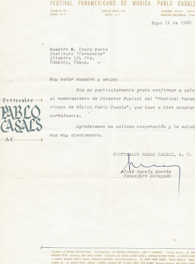 Nombramiento de Director Musical del "Festival Panamericano de Música Pablo Casals" Maestro N. Costa Horts Muy señor nuestro y amigo: Nos es particularmente grato confirmar a usted el nombramiento de Director Musical del "Festival Panamericano de Música Pablo Casals", que tuvo a bien aceptar verbalmente. Agradecemos su valiosa cooperación y le saludamos muy atentamente. FESTIVALES PABLO CASALS, A.C. José García Borrás |